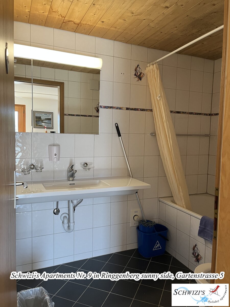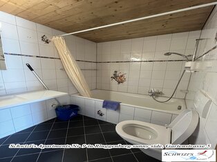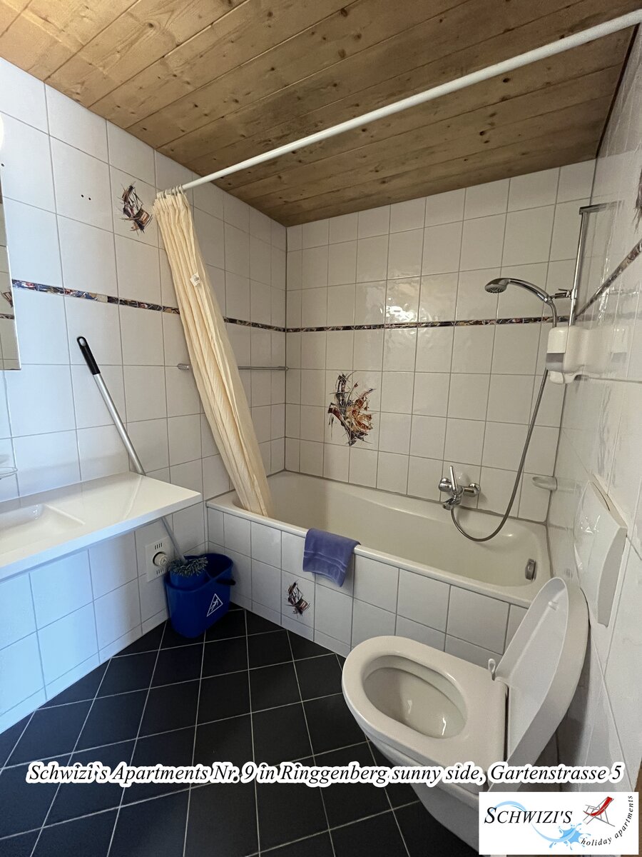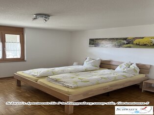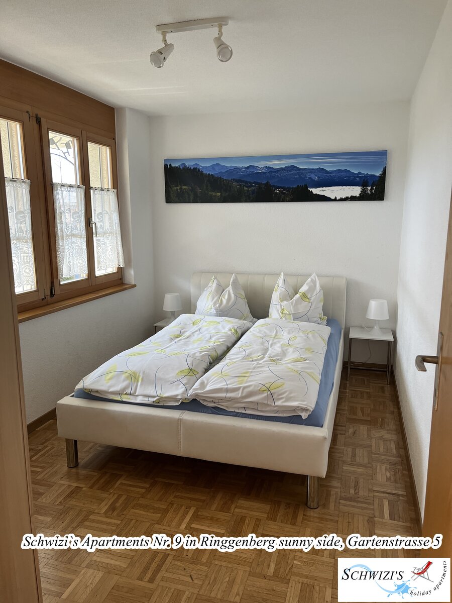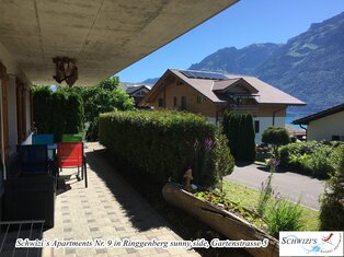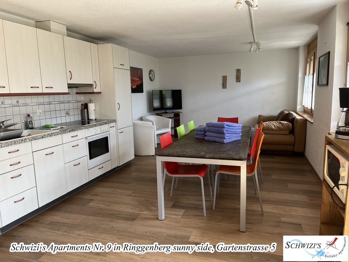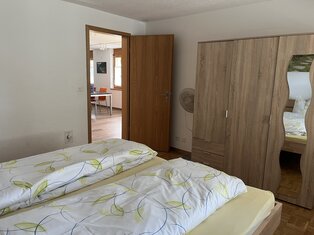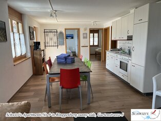 Wohn-/Esszimmer mit Bettsofa für 2 Personen, Esstisch. Offene Küche. 1 Schlafzimmer mit Doppelbett 180cm, 1 kleines Schlafzimmer mit franz. Bett 140cm. 1 Badezimmer mit Badewanne/WC. Aussensitzplatz mit Sonnenschutz und schönem Bergblick.