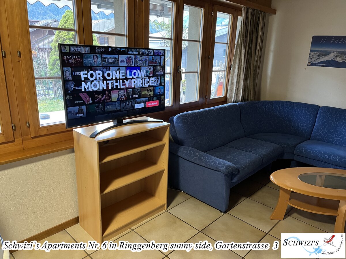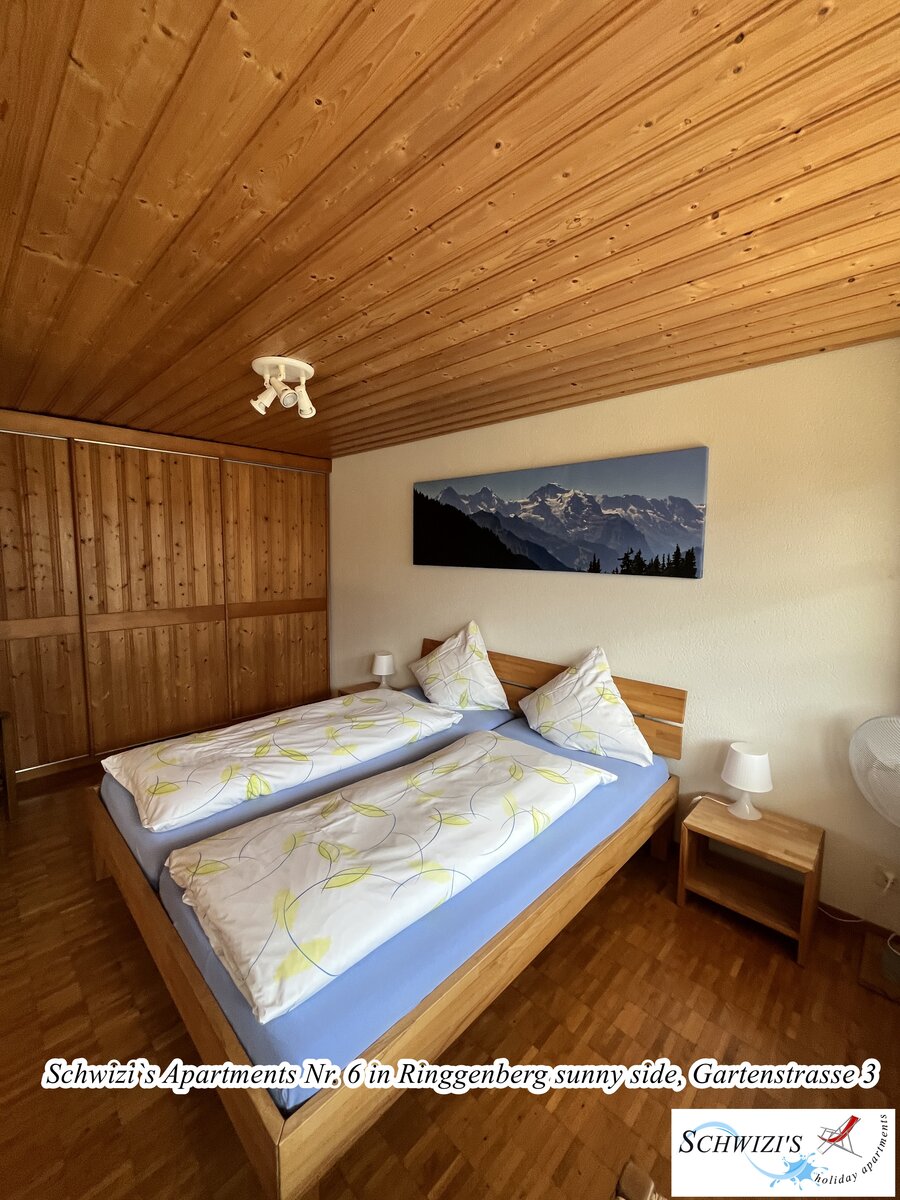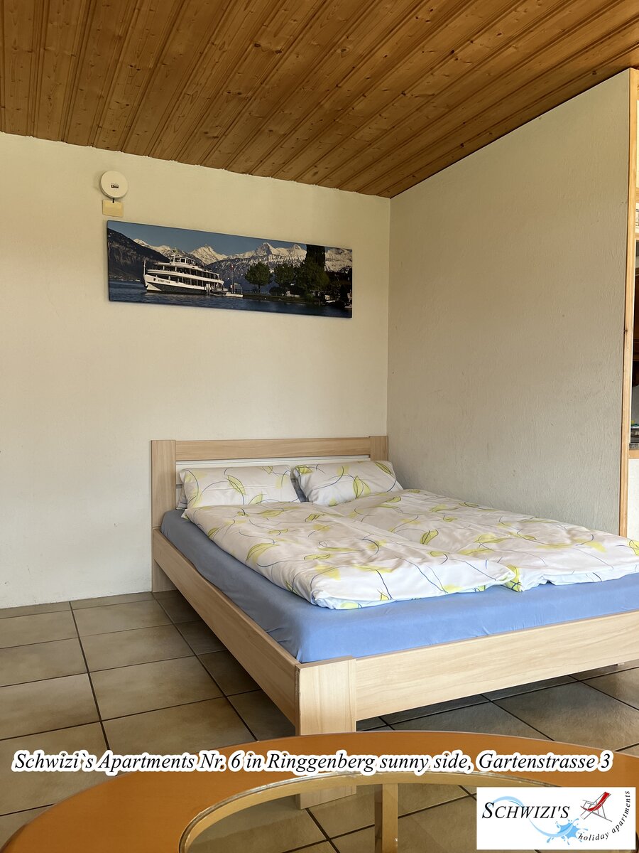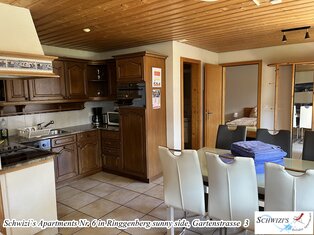 Wohn-/Esszimmer mit Sofa und Doppelbett für 2 Personen, Esstisch. Offene Küche mit Geschirrspüler. 1 Schlafzimmer mit Doppelbett. 1 Badezimmer mit Badewanne/WC. Gartensitzplatz 20m2 mit Sonnenschutz und schöner Bergsicht.