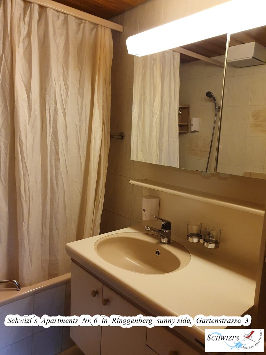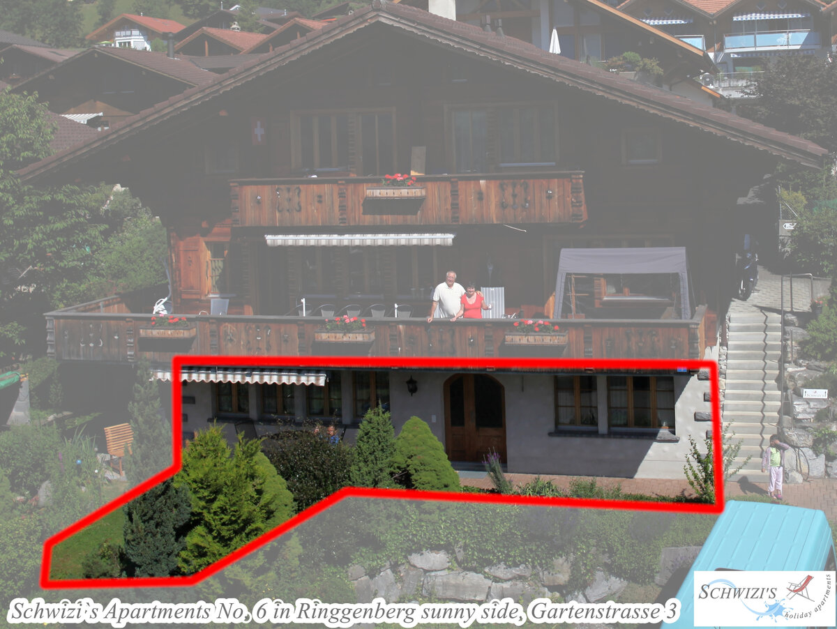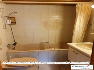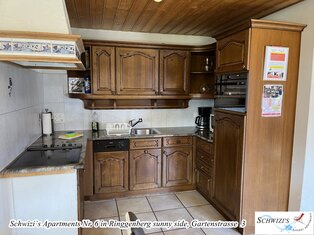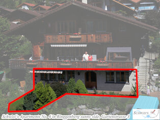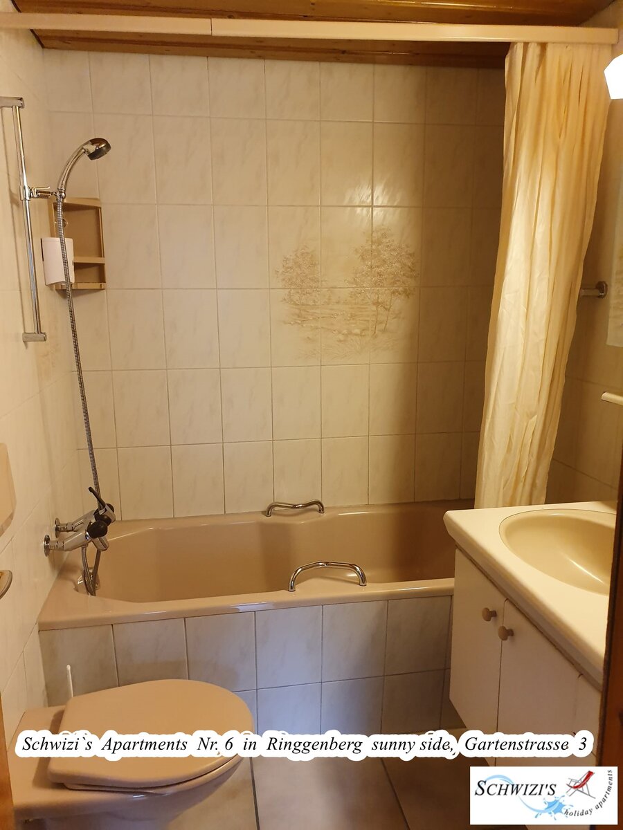 Wohn-/Esszimmer mit Sofa und Doppelbett für 2 Personen, Esstisch. Offene Küche mit Geschirrspüler. 1 Schlafzimmer mit Doppelbett. 1 Badezimmer mit Badewanne/WC. Gartensitzplatz 20m2 mit Sonnenschutz und schöner Bergsicht.