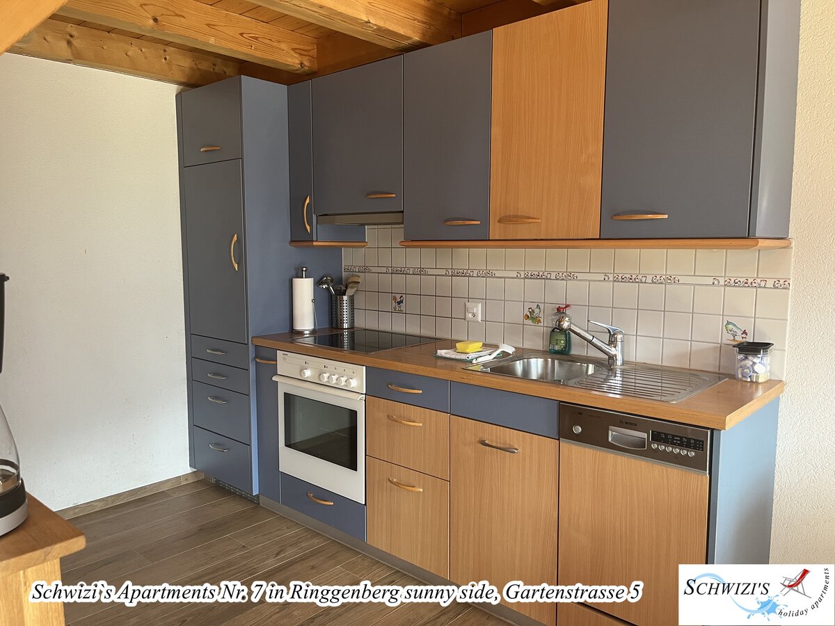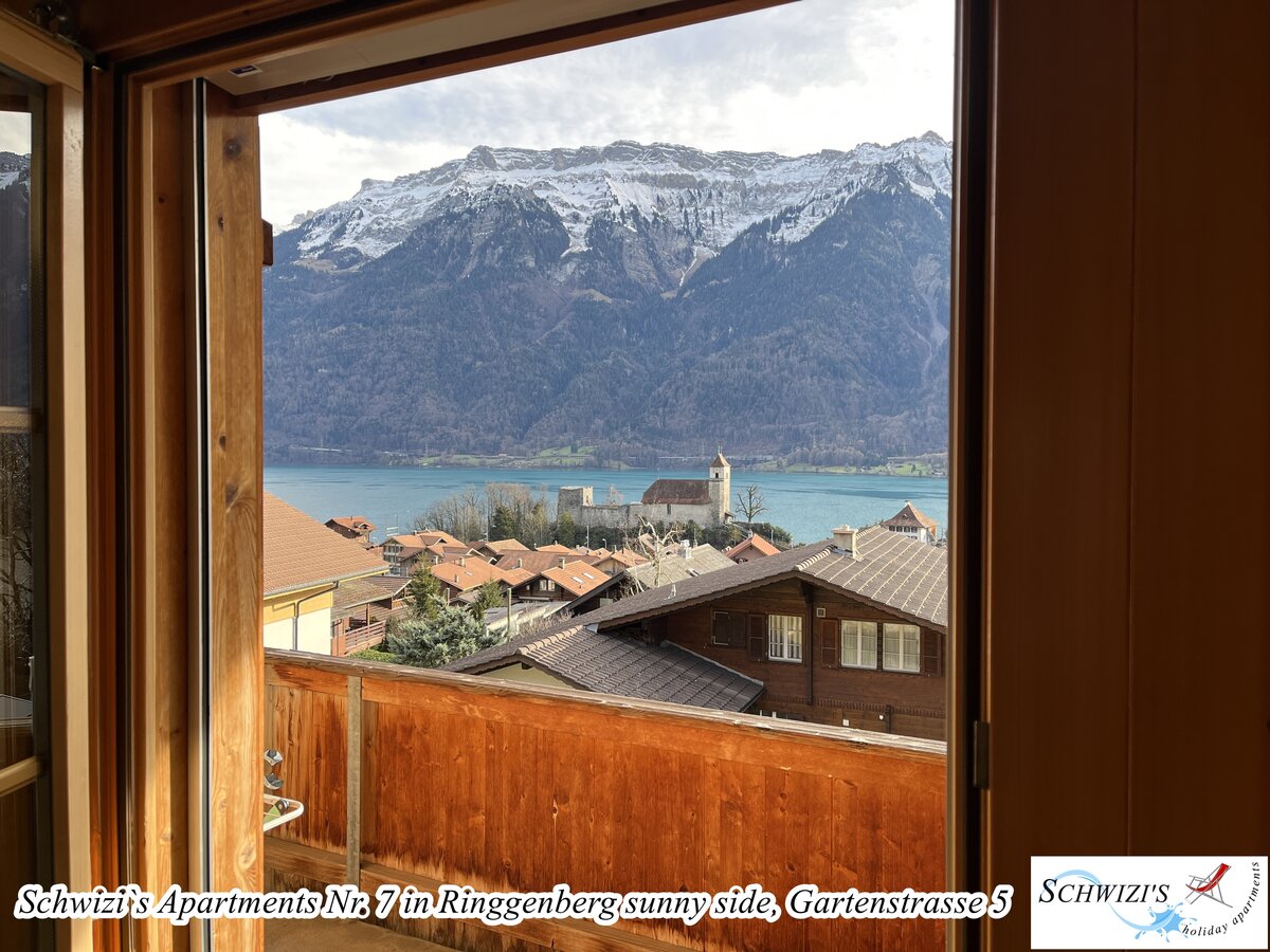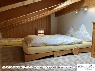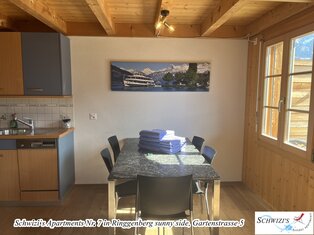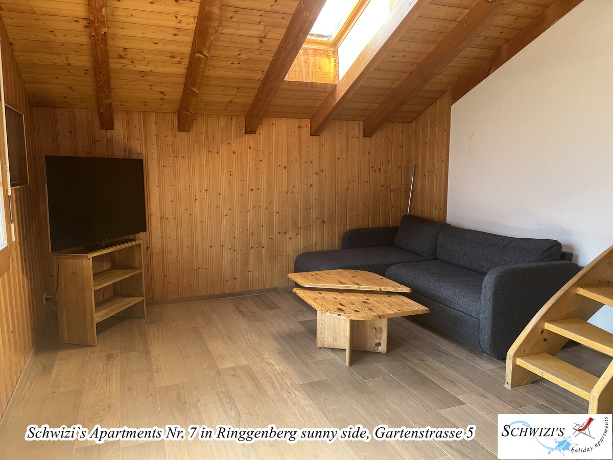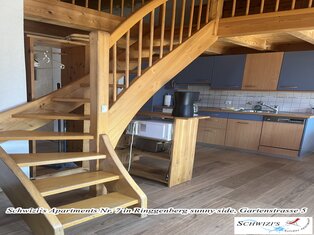 Wohn-/Esszimmer mit Sofa, Esstisch. Offene Küche mit Geschirrspüler. 1 Schlafzimmer mit Doppelbett. Schlafgalerie mit 3 Betten unter dem Dach (nur teilweise Stehhöhe). 1 Badezimmer mit Badewanne/WC. Balkon 9,4m2 mit wunderschöner Seesicht und Bergsicht.